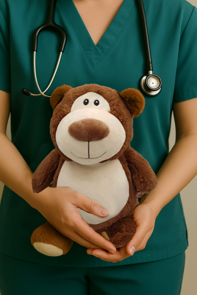 Introducing this bear to mama during her stay, having it sitting out near baby, is the best way to help mama associate the bear with her baby. Encouraging her to hold her bear, when she has to put her baby down, can help her get used to the feel of the bear. This can help with healing after leaving the hospital.