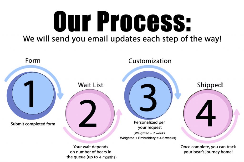 *For multiple losses, please fill out one form for each baby if you want a bear for each baby. If you’d prefer one angel bear holding multiple 2″ baby bears, please fill out one form and put that information in the additional information section.
